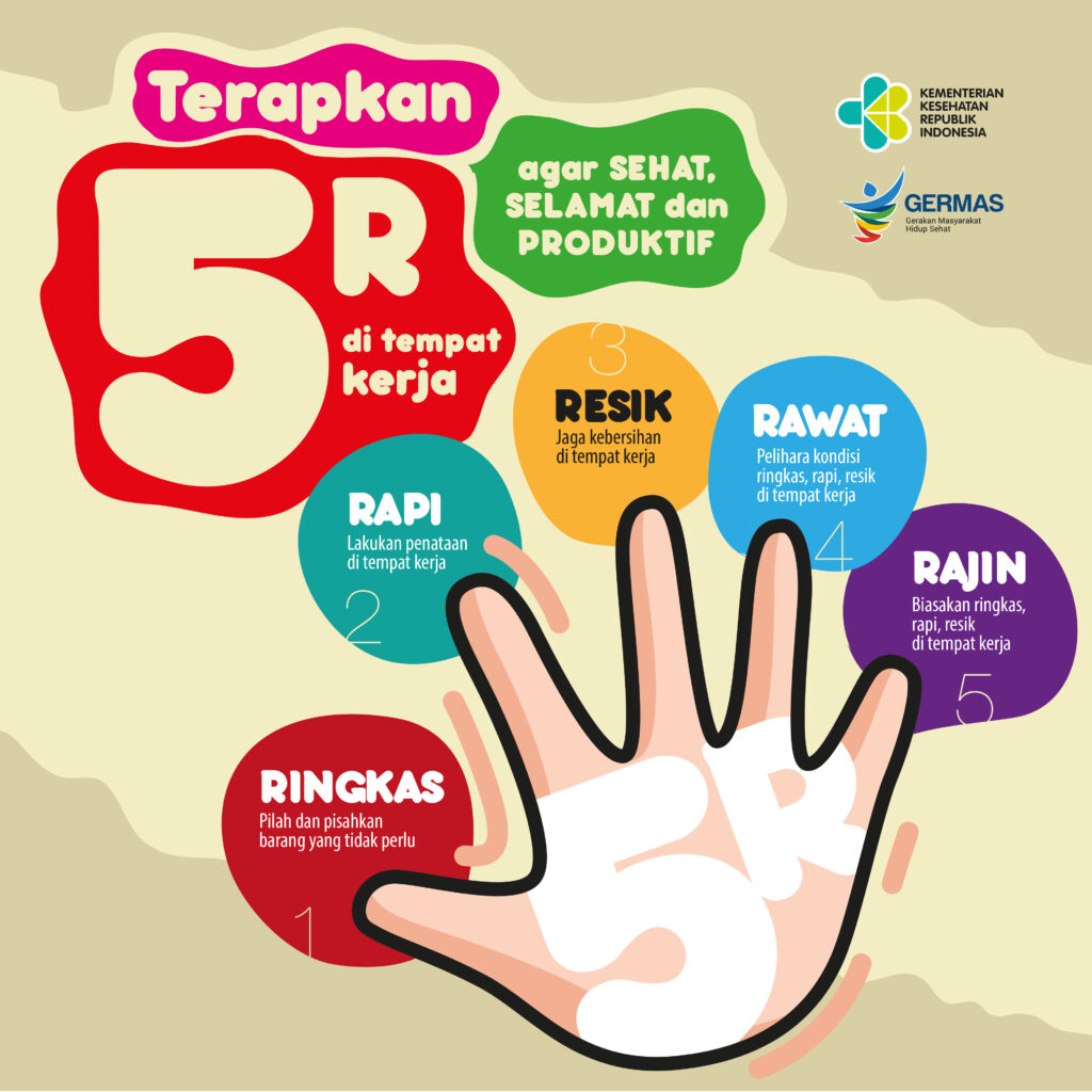 Budaya Kerja 5R (Ringkas, Rapi, Resik, Rawat, dan Rajin) merupakan suatu metode penataan dan pemeliharaan wilayah kerja secara intensif yang berasal dari Jepang yang dikenal dengan 5S yang digunakan oleh manajemen dalam usaha memelihara ketertiban, efisiensi, dan disiplin di lokasi kerja sekaligus meningkatan kinerja perusahaan secara menyeluruh. Klik Judul untuk penjelasan detil.